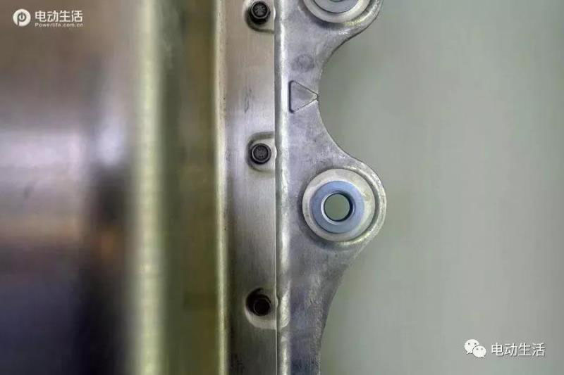 這是電池的下底部,也就是面對地面的部分,為了減重采用鋁合金材質(zhì)。這個(gè)部分相當(dāng)于咱們吃飯的飯盆,所有的東西都要被裝到這個(gè)飯盆里。圖為這個(gè)飯盆...哦不,是下箱體固定車身連接用的螺絲孔位。