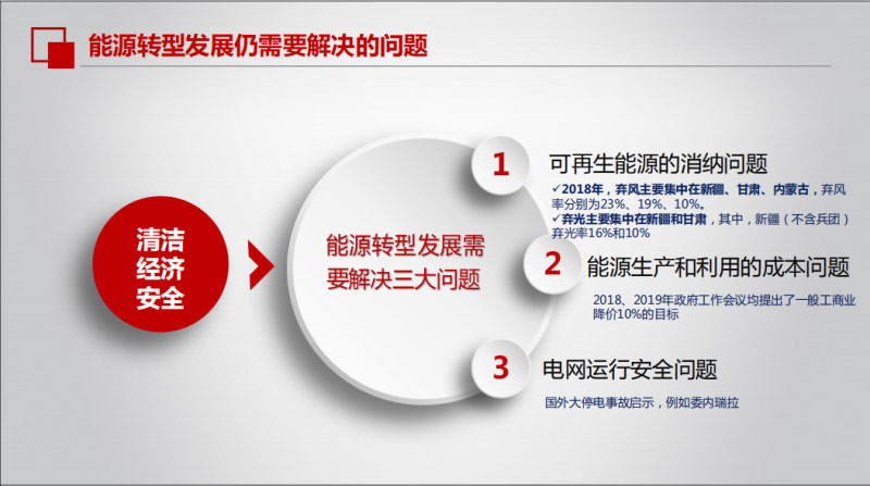 也有一些問(wèn)題急需我們解決的,首先第一個(gè)就是可再生能源消納問(wèn)題,覺(jué)得棄光棄風(fēng)現(xiàn)象比較嚴(yán)重的,新疆是達(dá)到了23%,甘肅達(dá)到了19%,另外像新疆甘肅的棄光比較嚴(yán)重,棄光率16%,甘肅是10%,這些都需要急需去解決的,第二個(gè)是能源生產(chǎn)還有利用成本的問(wèn)題,總理提出來(lái)了把一般的工商業(yè)定價(jià)降價(jià)10%。第三個(gè)就是電網(wǎng)運(yùn)行安全的問(wèn)題,我們國(guó)家在這方面表現(xiàn)的比較好,隨著越來(lái)越大規(guī)模的新能源的集中式的并網(wǎng)電力市場(chǎng)還有現(xiàn)貨市場(chǎng),對(duì)于電網(wǎng)安全運(yùn)行提出了一些新的挑戰(zhàn)的。引入社會(huì)資本創(chuàng)新能源投資及運(yùn)營(yíng)模式,能源互聯(lián)網(wǎng)是一種偏向于用戶側(cè)的這種能源生產(chǎn)能源利用形勢(shì),這樣可以降低電價(jià),對(duì)于降低用戶成本非常顯著的。