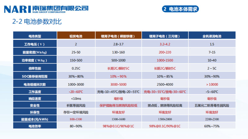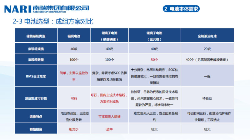 我們看看它的技術(shù)參數(shù)。我們當(dāng)時(shí)有三種:鉛炭、全釩液流、鋰離子。鉛炭成本相對較低一點(diǎn),它的循環(huán)壽命比較低。對于電網(wǎng)側(cè)來說我們其實(shí)也考慮過全釩液流,全釩液流的倍率特性比較高、循環(huán)次數(shù)比較好,液流的效率因?yàn)樗难h(huán)次數(shù)比較多,一般我們認(rèn)為應(yīng)該過1萬,現(xiàn)在也有企業(yè)說我們可以到2萬次左右的循環(huán),這樣可以攤薄,雖然建設(shè)成本比較高,壽命比較長,攤薄我的運(yùn)營成本。鋰離子電池,能量密度比較高,對于車來說用三元比較多,因?yàn)槿旧韥碚f,它會有輕微的析出氧氣的問題,所以現(xiàn)在對于電站來說,包括我們?nèi)ツ暝诮o湖南省公司做方案的時(shí)候,湖南省公司問南瑞,說你們對電池選型有什么想法,我說在2019年這個(gè)時(shí)間點(diǎn)下,可能磷酸鐵鋰是一個(gè)比較好的方式,但是磷酸鐵鋰代不代表一定是完美的,我個(gè)人持一定的保留態(tài)度,原因是因?yàn)榻衲暌渤隽艘恍┝姿徼F鋰的問題。對于電網(wǎng)側(cè)儲能的需求來說,我們需要兼顧調(diào)頻、調(diào)峰包括調(diào)壓所有的場景。