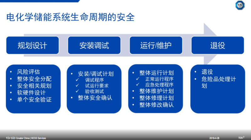 儲能系統(tǒng)風(fēng)險(xiǎn)管理應(yīng)該在全生命周期管控,而不是說我安裝完一后管控他它的風(fēng)險(xiǎn)。風(fēng)險(xiǎn)包括規(guī)劃設(shè)計(jì)階段,比如說規(guī)劃設(shè)計(jì)階段我的設(shè)備制造商要去做本身產(chǎn)品的風(fēng)險(xiǎn)評估,我要知道哪些風(fēng)險(xiǎn)會存在,比如我過充、過放、過溫的時(shí)候我的產(chǎn)品風(fēng)險(xiǎn)來源是什么、我的風(fēng)險(xiǎn)概率是多少、我造成的后果有多大,比如風(fēng)險(xiǎn)出來了,我要做整體安全的分配。還有安全相關(guān)的規(guī)劃,比如每個(gè)器件、每個(gè)子系統(tǒng)怎么去規(guī)劃的,還有軟硬件實(shí)際的設(shè)計(jì),設(shè)計(jì)完之后對單個(gè)功能或者單個(gè)安全的認(rèn)證。安裝調(diào)試階段,包括我們要編制一些安裝調(diào)試計(jì)劃來保證我們系統(tǒng)的安全調(diào)試或者安全運(yùn)行,包括調(diào)試程序,還有試運(yùn)行的一些要求、驗(yàn)收的一些措施。安裝完之后對整體安全確認(rèn)的過程。運(yùn)行、維護(hù)階段,運(yùn)行之后5年、10年有一個(gè)整體運(yùn)行計(jì)劃的編制,比如他的正常運(yùn)行的程序,還有應(yīng)急處理這些程序,還有整體的一些維護(hù)計(jì)劃、整體的優(yōu)秀計(jì)劃,整體修改的確認(rèn)。退役階段,包括它的電池如何去做退役,還有危險(xiǎn)品的處理計(jì)劃。