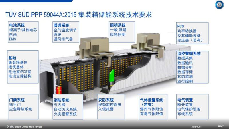對整個(gè)文件和審核階段,包括以上所有的文件我們都會進(jìn)行審核,包括一些集裝箱、PCS、電池等等文件的審核,還有現(xiàn)在結(jié)構(gòu)的一些檢查,包括安裝結(jié)構(gòu)、部件結(jié)構(gòu)、照明的檢查?,F(xiàn)場測試,包括一些氣密性測試、絕緣測試、耐壓測試、相序測試等等。整個(gè)PPP59044做完之后,結(jié)構(gòu)和驗(yàn)證做完之后我們就會發(fā)TUV的證書,前天我們在這個(gè)廳里面發(fā)了1兆瓦時(shí)的鵬輝的證書,之前中天的證書已經(jīng)拿到。我們產(chǎn)品包括電池的一些措施,就不再講了。