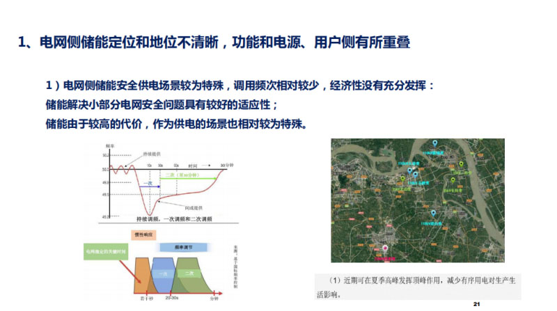 目前我們電源側(cè)和用戶側(cè)商業(yè)模式是比較成熟的,就是說不管是電池選擇來說、運用場景來說,還有怎么投資回收來說,都是比較成熟的,一個是定位比較清晰,我要怎么做,回收模式我怎么把錢收回來,都是比較清楚的,我們電源側(cè)儲能目前存在幾個問題,一個是定位和定位不清晰,功能和電源用戶側(cè)有所重疊,一個是我們電網(wǎng)側(cè)儲能安全供電場景相對比較特殊,但是容量比較大,調(diào)用的頻次比較少,僅從安全性原因來說,調(diào)用頻次比較少,因為你是作為電網(wǎng)的安全性手段,有可能一年都發(fā)生不了一次,經(jīng)濟性就沒有充分發(fā)揮,儲能解決小部分電網(wǎng)安全問題可能具有比較好的適應(yīng)性,但是它作為一個較高的代價,如果僅作為一個供電削峰來說,其實代價也比較大,供電的場景也是較為特殊的,好比江蘇鎮(zhèn)江這么一個場景,如果找第二個這么一個場景,其實相當(dāng)難找。