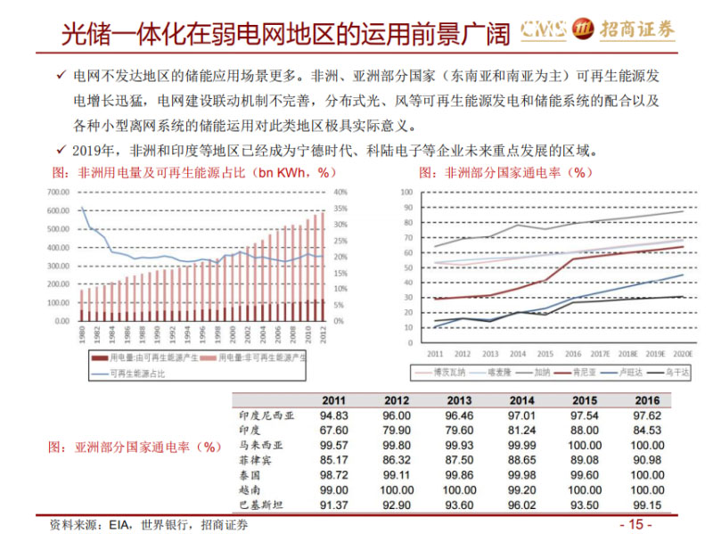 第二個,光儲一體化。實際上光儲一體化剛才提過,今年澳洲項目很好,好到什么程度?應(yīng)該是幾倍的增長。原因,一個是澳洲出了補貼,大概是多?1.5億還是1.6億澳元,相當(dāng)于60億人民幣左右的補貼,一個政策刺激。第二個,因為澳洲的戶用光伏,就是分布式光伏比較強,他一個很大的原因是貼戶用光伏做的。還有一個就是剛才講的,這是講我們發(fā)達市場,另外一個,有些實際上是小型離網(wǎng)市場,典型的就是印度和非洲。大家看,我們做企業(yè),就是我們這兒有很多企業(yè)家的領(lǐng)導(dǎo)可能在,剛才還在跟我們聊,就是說企業(yè)的終極問題是解決人類的問題,要解決需求的問題,實際上非洲兄弟們點著煤油燈呢,你如果幫他想辦法帶來文明進步應(yīng)該能賺錢。很多地方電氣化比例只有10%幾,基本上是中國六七十年代。實際上我們看印度的很多、包括非洲很多應(yīng)用,就是一個小的光伏板,搭一個照明,或者有的再大一點的點個電視機,這種市場增長是挺快的,我們也人如果接觸市場應(yīng)該很容易理解這個市場增長很快的,這都是光儲一體化。還有UPS應(yīng)用,實際這個講的太窄了,除了這個之外,為什么這樣說呢?UPS本質(zhì)上講,原來我們配UPS不是說一定賺多少錢,有必要性,有些場合不能停電,一定要裝UPS,是必要性,不是經(jīng)濟性。你如果能夠讓本來裝上去的,這個產(chǎn)品如果能參與儲能多賺點錢的何樂而不為,實際上你在原來已經(jīng)有的這個系統(tǒng)上做了一個加強的經(jīng)濟版的升級,可能產(chǎn)品端需要改,有些離線式的東西你讓它頻繁的深充深放時間太長,它的循環(huán)次數(shù)太短,產(chǎn)品需要升級。特斯拉能應(yīng)用很大的原因,Powerwall用的很大原因,大部分是豪宅別墅,供電可靠性基于原因去裝,如果你能他賺錢嗎,當(dāng)然是零花錢,大家可以關(guān)注。還有一個市場要開始啟動,通信,鐵塔不知道大家有沒有研究這個市場,它也是備用電源,它原來做通信基站這個市場,本來一定要配的,這是算在他的成本里面的,他們也搞了梯次利用,我覺得那個有點扯淡。反過來講,就算按照他現(xiàn)在的方案,把后備電源裝上去以后,如果產(chǎn)品能夠升級,參與峰谷價差去套利的話,他們會做的,我們知道有些企業(yè)應(yīng)該參與做方案了,應(yīng)該關(guān)注一下,鐵塔這個市場是UPS的升級版。我覺得這個行業(yè)的方向前景是很好的,但是這個商業(yè)模式應(yīng)該說現(xiàn)在還在商業(yè)模式初期,大部分的國內(nèi)國外的商業(yè)模式探索都還沒有擺脫補貼依賴,包括美國、德國、日本、澳洲,特別像韓國一樣的,都還沒有完全擺脫補貼依賴。第二個觀點,大家要有長期的意識,就是說儲能這個產(chǎn)業(yè),除了用戶端以外,其他環(huán)節(jié)唱起來看,我覺得這個模式就比較難擺脫政策依賴,剛才說過,這是新鮮產(chǎn)業(yè)里邊依賴性最強的一個方向。