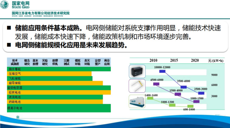 儲能為什么在這個時間點(diǎn)開始推廣應(yīng)用?儲能發(fā)展了很多年,從2010年之前就開始在研究。但實(shí)際上,最關(guān)鍵的成本問題,儲能要在電力系統(tǒng)里應(yīng)用的問題,成本只有低到了一定階段才具備商業(yè)化的可能,電網(wǎng)里面用的時候也是一樣的,在這樣的背景下他能否替代我們傳統(tǒng)的一些電力設(shè)施來保證和優(yōu)化我們電網(wǎng)的發(fā)展,儲能的成本下降給我們在電網(wǎng)側(cè)的應(yīng)用創(chuàng)造了條件。從產(chǎn)業(yè)鏈來講,無關(guān)是從國家五部委還是江蘇省能源局,其實(shí)都有產(chǎn)業(yè)推動的一些需要,也印發(fā)了大量的政策措施來推動,主要標(biāo)志還是2017年國家能源局的文件推動。從江蘇電力公司來講,從我們建設(shè)電網(wǎng)主要是服務(wù)于電網(wǎng)安全,目前我們已經(jīng)做了一個大規(guī)模源、網(wǎng)、荷的友好互動系統(tǒng),但是友好互動系統(tǒng)的資源在哪里?以前我們在用戶上面去找,這個經(jīng)濟(jì)可用的用戶側(cè)資源其實(shí)是有限的,而且比較分散,在此基礎(chǔ)之上需要通過儲能來對可調(diào)控資源進(jìn)行補(bǔ)充。通過儲能的應(yīng)用,可以提升我們電網(wǎng)的瞬時、短時和時段三個能力,來提高電力系統(tǒng)的安全水平。同時,為推動儲能的應(yīng)用,江蘇公司內(nèi)部充分調(diào)動資源,協(xié)調(diào)公司相關(guān)部門按照職責(zé)分工都來參與儲能應(yīng)用的研究。