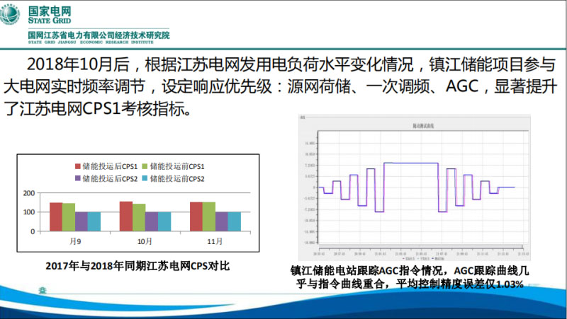夏季高峰以后,其他的時段怎么運(yùn)行呢。電網(wǎng)側(cè)儲能的運(yùn)行設(shè)了優(yōu)先級,第一級,就是前面介紹過的,納入到源、網(wǎng)、荷、儲事故應(yīng)急響應(yīng),這個是最快的,也是優(yōu)先級最高的。第二級,就是一次調(diào)頻,就是說電網(wǎng)在響應(yīng)頻率下降的時候,電網(wǎng)本身的一次調(diào)頻能力不足,通過儲能電站來響應(yīng)一次調(diào)頻的功能,這個作用對電網(wǎng)的支撐是非常有效的。在之后才是納入我們的AGC,通過儲能電站參與電網(wǎng)的頻率調(diào)節(jié)以后,讓他響應(yīng)ACE的信號進(jìn)行控制,對我們CPS指標(biāo)的考核其實(shí)是非常有好處的。下面做了一些CPS指標(biāo)的對比,效果是比較明顯的。