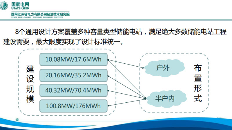 在鎮(zhèn)江儲能電站實(shí)踐的基礎(chǔ)上,通過總結(jié)在調(diào)試、運(yùn)行階段存在的問題,提出了優(yōu)化方案。編制《儲能電站關(guān)鍵設(shè)備技術(shù)規(guī)范》,這個《規(guī)范》就是針對一些關(guān)鍵設(shè)備,主要是變流器、儲能電池、監(jiān)控系統(tǒng)等等進(jìn)行規(guī)范,確保儲能電站與電網(wǎng)協(xié)調(diào)運(yùn)行。還編制了《江蘇省電網(wǎng)儲能電站模塊化典型設(shè)計方案》,希望通過模塊化的設(shè)計,在新的儲能電站可以更簡單、快速的應(yīng)用。對電站進(jìn)行優(yōu)化升級,主要提升三個方面:綜合性能、選型標(biāo)準(zhǔn)、優(yōu)化設(shè)計。編制的技術(shù)規(guī)范書,通過了外部專家評審,典型方案則根據(jù)工程規(guī)模、應(yīng)用形式,分別設(shè)計典型應(yīng)用方案。典型設(shè)計包括了八個方案,按照儲能電站功率包括了1萬、2萬、4萬和10萬千瓦,配電裝置形式有戶外的、有半戶內(nèi)的,設(shè)置這樣的模塊基本上能夠滿足大部分工程建設(shè)的需要。