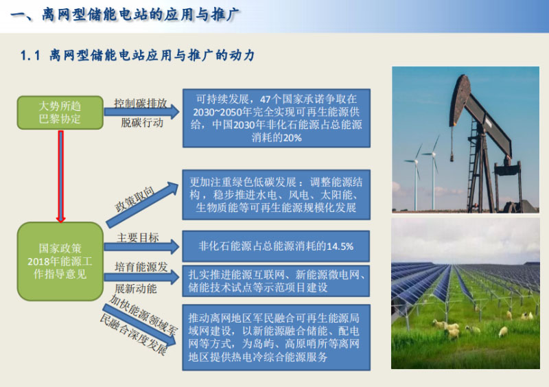 離網(wǎng)型儲(chǔ)能電站得以推廣的外因包括兩個(gè)方面,大的環(huán)境和國(guó)家政策。大的環(huán)境概括為四個(gè)字,就是大勢(shì)所趨,2016年摩洛哥世界氣候大會(huì)上,47個(gè)國(guó)家承諾城區(qū)在2030-2050年完全實(shí)現(xiàn)可再生能源供給。當(dāng)時(shí)中國(guó)的承諾是2030年將非化石能源占總能源消耗的20%。國(guó)家政策層面,2018年國(guó)家能源局出臺(tái)了國(guó)家能源指導(dǎo)意見(jiàn),明確了綠色低碳發(fā)展的政策取向,調(diào)整能源結(jié)構(gòu),穩(wěn)步推進(jìn)水電、風(fēng)電、太陽(yáng)能、生物質(zhì)能可再生能源規(guī)?;l(fā)展。主要目標(biāo)是2018年將非化石能源占總能源消耗提高到14.5%。指導(dǎo)意見(jiàn)中有兩條涉及到了儲(chǔ)能電站或離網(wǎng)型儲(chǔ)能電站,第一條是培育能源發(fā)展新動(dòng)能,扎實(shí)推進(jìn)能源互聯(lián)網(wǎng)、新能源微電網(wǎng)還有儲(chǔ)能技術(shù)試點(diǎn)能示范項(xiàng)目的推進(jìn),另外一條,其實(shí)跟我們現(xiàn)在所設(shè)計(jì)的項(xiàng)目是比較貼切的,推動(dòng)離網(wǎng)地區(qū)可再生能源局域網(wǎng)建設(shè),以新能源融合儲(chǔ)能還有配電網(wǎng)等方式,提供熱電冷綜合能源服務(wù)。
