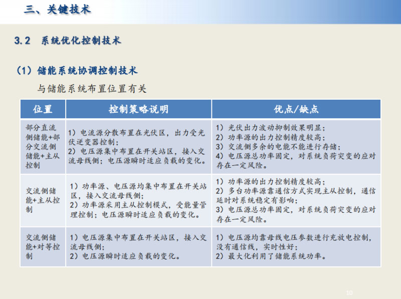 下面講一下優(yōu)化控制技術(shù),它主要與儲(chǔ)能系統(tǒng)布置位置有關(guān)。主要有三種,第一種是部分直流側(cè)儲(chǔ)能+部分交流側(cè)儲(chǔ)能,第二種是交流側(cè)功能,第三種是交流側(cè)能是在電壓源。主要講一下控制方式。主流的是對(duì)等控制和主從控制。一個(gè)是有線(xiàn)的,一個(gè)是無(wú)線(xiàn)的。實(shí)際運(yùn)行的時(shí)候,特征表現(xiàn),對(duì)等控制對(duì)整個(gè)系統(tǒng)的調(diào)節(jié)要比主從快得多??刂撇呗赃@一塊不詳細(xì)講了。第二種是電網(wǎng)系統(tǒng)能量管理系統(tǒng),實(shí)現(xiàn)全網(wǎng)源、荷匹配的監(jiān)視、掉節(jié)、控制。具體功能就是能量平衡自動(dòng)計(jì)算、遙控發(fā)電單元、AGC/AVC自動(dòng)調(diào)節(jié)、儲(chǔ)能系統(tǒng)協(xié)調(diào)控制、微網(wǎng)系統(tǒng)二次調(diào)頻、黑啟動(dòng)、FA、功率預(yù)測(cè)、負(fù)荷預(yù)測(cè)等。整個(gè)系統(tǒng)的能量平衡計(jì)算是它自己算的,AGC怎么調(diào),是自己算了之后自己再下發(fā)。我們?cè)谀芰抗芾硐到y(tǒng)一定要注意它的性能,它比常規(guī)電站計(jì)算功能要稍微大一點(diǎn)。下面是提供了一個(gè)簡(jiǎn)單的能量管理系統(tǒng)框圖。它可以根據(jù)離網(wǎng)型電站規(guī)模來(lái)調(diào)整。小型的可以把功能集成。