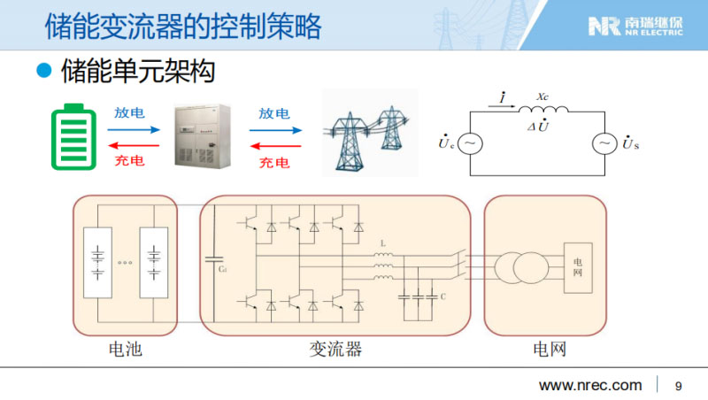 第二部分,介紹一下儲能有這么多好處,沒有實現(xiàn),但是有很多工作可以做。從技術方面還有哪些工作可以做呢?儲能變流器首先有自身的控制策略,儲能有整個系統(tǒng)的控制模式。先看看儲能變流器本身有哪些控制策略。第一個是儲能單元架構(gòu),大家都很清楚。這可以等效于右上角的模型,它跟電網(wǎng)之間通過連接阻抗聯(lián)系在一起。儲能系統(tǒng)與電網(wǎng)交換的有功和無功功率見表達式,這個表達式里面電網(wǎng)的電壓幅值Us,儲能作為電源的幅值是Uc,兩個電壓相量的夾角δ,也稱為功角。通過調(diào)節(jié)變流器輸出的Uc和δ值,可以實現(xiàn)變流器輸出的有功和無功雙向可控,它在四象限可以運行,調(diào)節(jié)性能非常優(yōu)秀,充分發(fā)揮儲能的調(diào)節(jié)性能。具體如何實現(xiàn)這樣的調(diào)節(jié)?右下角的圖,Uc是怎么來的,Uc是控制出來的。變流器在PWM載波控制下,其輸出幅值及與系統(tǒng)電壓的相位是由控制系統(tǒng)調(diào)節(jié)計算得到的調(diào)制波決定的。請看控制框圖,最左邊Xd*是某一個被控目標值的給定值,Xd是被控目標的測量值,當閉環(huán)控制系統(tǒng)達到穩(wěn)定平衡的時候,Xd*就等于Xd,同樣的另外一個維度,Xq*就等于Xq。假如把目標值設定成有功功率和無功功率,那么控制系統(tǒng)穩(wěn)定時,儲能系統(tǒng)輸出的有功功率就會等于有功功率給定值,無功功率也等于無功功率的給定值,這時的控制就稱為PQ模式。當Xd和Xq分別為頻率和電壓時,這時的控制就稱為VF模式這是變流器的一種控制策略。