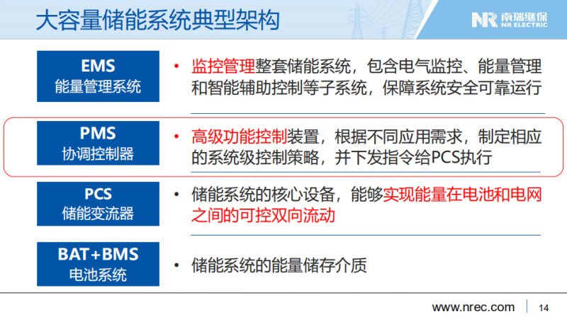 有了變流器控制策略以后,把它用到大容量儲能系統(tǒng)里面,儲能系統(tǒng)有哪些控制模式呢?第一,以一次調(diào)頻一次調(diào)壓模式運行是可以的。還有二次調(diào)頻二次調(diào)壓,就是PQ模式。離網(wǎng)的時候可以恒頻恒壓,還有可以PQ模式。作為一個儲能系統(tǒng),頂層是EMS加PMS,功能強大,系統(tǒng)就很好。大容量儲能系統(tǒng)比如100MW系統(tǒng),按目前的一個PCS功率500KW考慮,就要兩百臺的PCS。并網(wǎng)運行如果參與電網(wǎng)的調(diào)節(jié),需要大家行為一致,才能對系統(tǒng)做最好的貢獻,但要求200臺PCS行為一致是不可能的,個體存在的微小偏差,在動態(tài)過程中相互作用,可能會放大并對最終結(jié)果產(chǎn)生較大影響,甚至不能達到系統(tǒng)控制的要求。我們的解決方案是在PCS之上增加一個控制設備,叫PMS協(xié)調(diào)控制器。協(xié)調(diào)控制器可以根據(jù)需要配置多臺,形成中間控制層,這就構(gòu)成了一個EMS+PMS+PCS的三層次控制管理架構(gòu)。有什么好處呢?高級控制功能可以放在中間層來做,根據(jù)不同應用要求可以定制系統(tǒng)控制策略。中間層根據(jù)高級應用策略進行控制計算,計算結(jié)果出來之后平均分給各個PCS執(zhí)行。這樣PCS的輸出一致性就會非常好,不會有很多偏差,總的控制效果就會很好。