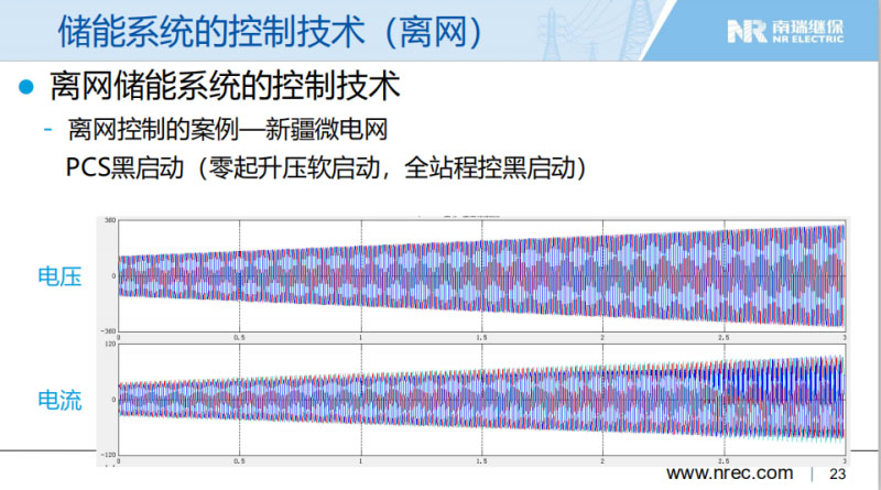 離網(wǎng)方面,儲能系統(tǒng)作用更大。在離網(wǎng)模式下,整個系統(tǒng)慣量比較小,常常用虛擬同步機模式運行,也可以V/F模式運行。離網(wǎng)儲能系統(tǒng)的控制,實現(xiàn)離網(wǎng)系統(tǒng)多VSG并聯(lián)穩(wěn)定運行的技術。我們提出一些自有的技術,比如說自校正的轉(zhuǎn)子運動方程優(yōu)化控制等。下面不詳細講。離網(wǎng)儲能系統(tǒng)也有一個案例,新疆微電網(wǎng)。我們實現(xiàn)32臺PCS虛擬同步機模式并聯(lián),作為主電源支撐整個微電網(wǎng)的電壓和頻率穩(wěn)定。左邊是監(jiān)控,中間是現(xiàn)場照片。儲能變流器承受變壓器直接沖擊,系統(tǒng)電壓、頻率平穩(wěn)過渡。整個系統(tǒng)黑了以后,實現(xiàn)自動邏輯的PCS黑啟動。