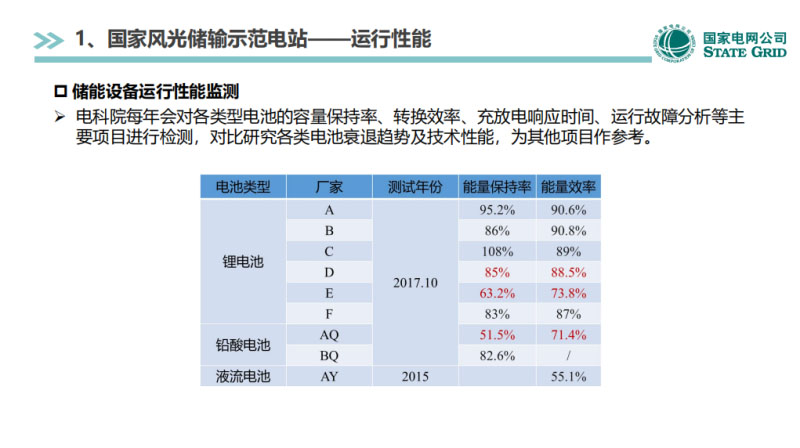 因?yàn)槲覀兪请娍圃?,這幾年對風(fēng)光儲(chǔ)的儲(chǔ)能從投運(yùn)到現(xiàn)在有七八年的時(shí)間了。這是一些實(shí)驗(yàn)的主要結(jié)果,2017年10月份一次實(shí)驗(yàn)的結(jié)果。電池廠家也很多,能量保持率還有能量轉(zhuǎn)化的效率,差異性還是比較大的。好的效率能在90%左右。這個(gè)效率是沒有包含變流器的,所以會(huì)偏高一些。根據(jù)單體電壓還有內(nèi)阻抗對劣化的電池做一個(gè)識別。每年風(fēng)光儲(chǔ)都要換掉一些電池,由廠家去更換。電科院跟風(fēng)光儲(chǔ)開展的一些工作。