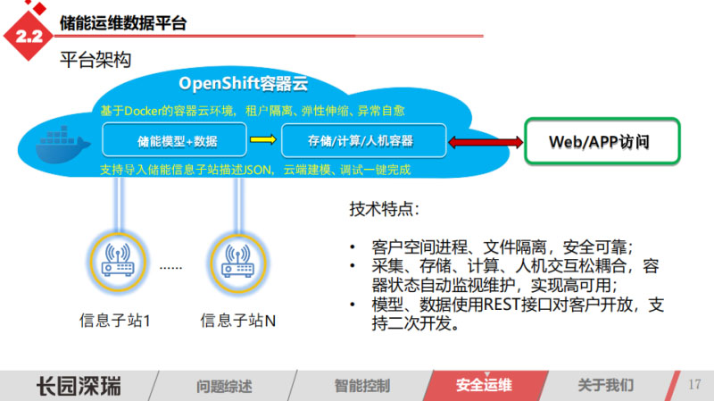 張云:各位領(lǐng)導(dǎo)專家,大家上午好!很榮幸能夠代表公司給大家做電化學(xué)儲能智能控制、安全運維技術(shù)應(yīng)用。我今天匯報的內(nèi)容分為四個部分,分別是儲能控制運維領(lǐng)域亟待解決的問題、智能控制與安全運維方面的探索和沉淀以及對公司儲能產(chǎn)品與實踐的簡要介紹。