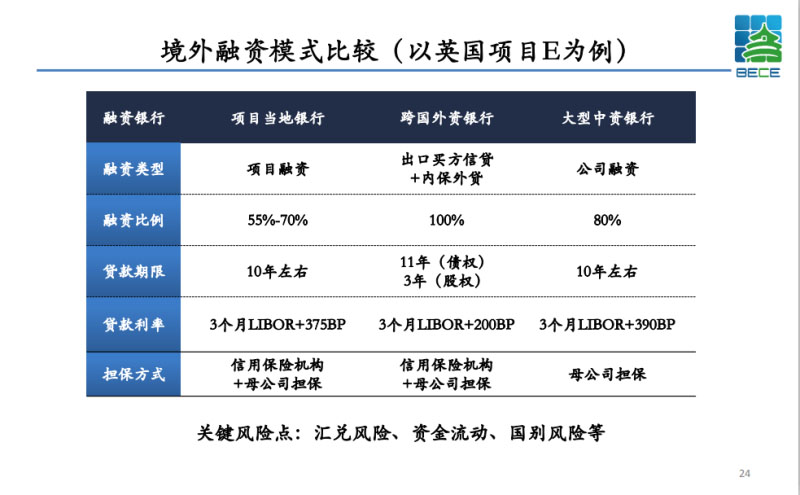 下面簡(jiǎn)要說(shuō)一下我們?cè)诰惩獾膸讉€(gè)項(xiàng)目。這是在英國(guó)北部建的一個(gè)120MWh的項(xiàng)目。主要是用買方信貸模式,基本上是全融資。融資銀行也是幾家銀行聯(lián)合,像渣打、國(guó)開行、蘇格蘭皇家銀行、桑坦德銀行,額度4200萬(wàn)英鎊。這是在澳大利亞的一個(gè)調(diào)頻調(diào)峰的項(xiàng)目,也是通過(guò)項(xiàng)目融資的模式,聯(lián)合了星展、國(guó)開行、澳洲國(guó)民銀行來(lái)做的項(xiàng)目,也是通過(guò)買方信貸的模式。還有在加拿大安大略省,運(yùn)用產(chǎn)業(yè)基金模式,目前集團(tuán)在加拿大與美國(guó)、養(yǎng)老基金共同發(fā)起設(shè)立海外儲(chǔ)能產(chǎn)業(yè)基金,收購(gòu)目標(biāo)公司股份,并進(jìn)行相關(guān)運(yùn)維管理。這是剛才的幾個(gè)項(xiàng)目融資模式的簡(jiǎn)要對(duì)比。這是境外機(jī)構(gòu)的一個(gè)融資模式的對(duì)比。