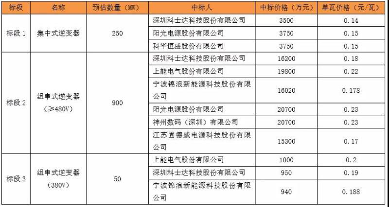 日前,中能建公示了該公司2019-2020年光伏逆變器集中采購(gòu)項(xiàng)目定標(biāo)結(jié)果,科士達(dá)、陽(yáng)光電源、科華恒盛、上能電氣、錦浪科技、固德威成功中標(biāo)。詳細(xì)中標(biāo)結(jié)果如下: