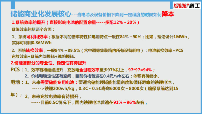 另外一個,就是整個系統(tǒng)里的效率。強調全過程,就算PCS全過程效率至少97%。最終目的都是為了提升整個系統(tǒng)的成本。另外,至少到目前為止,沒有真正看到太多的為儲能專用的電池,大多數都是車載直接挪過來。很多電池都是車上用的,乘用車,小一點的大巴,直接用能儲能上。但是車和儲能完全不一樣。至少有十點不一樣,國標行標不一樣,層級架構不一樣,電池并聯容量不一樣,功率相差十倍等等,電源等級也不一樣。儲能因此要有專用電池,更強調壽命,要十年、十五年。能量密度要高,循環(huán)壽命要長,達到6000次差不多了。正常情況下跑個十年十五年沒有任何問題。另外就是充放電效率有待提升。充一度電進去能放出多少度電。0.5C情況下,國內鐵鋰電池普遍91%-96%左右??赡軆炔拷Y構、內阻大小都不一樣。用數據說話,這就相差四到五個點。