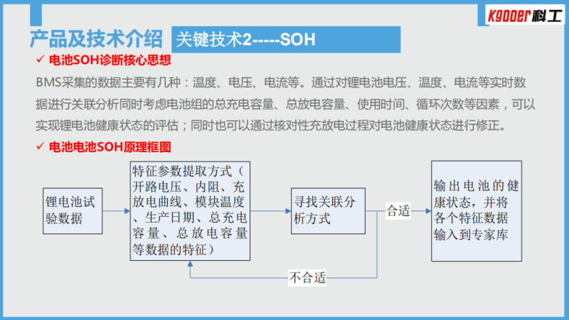 公司介紹就略過,就做了三塊業(yè)務,第一塊是BMS和就地監(jiān)控,第二塊是梯次電池利用,第三塊是做了系統(tǒng)集成。到2019年2月份,我們做了1.3GWh的儲能電站,比亞迪的沒有算。發(fā)明專利和其他專利32項不多說,第三年不不到就拿到了國家高新企業(yè)的證書。這是合作伙伴,大概有50多家長期合作的。這是系統(tǒng)架構介紹,我們不需要加任何轉換器,本身就支持各種規(guī)約(含IEC61850)。這是儲能BMS需要具備的一些基本功能。電池變化怎么樣,另外就是單位時間內的溫升和電壓,到底有多大變化,有沒有及時反應出來。第二是各種異常,要及時找出來。人家用你的BMS,這些功能都沒有的話,BMS就起不到太多作用。這是SOC策略,這就比較復雜。這是SOH,找了相關曲線,前提是要有大量的歷史數據。這是主動均衡,這是科工最大的一個優(yōu)勢。主動均衡最大5安培。在很多調頻站都有運用,效率達到87%、88%。這是跟同行的差異,均衡差異到底在哪里。這就略過,這是我們自己做的就地監(jiān)測。這是我們的產品,也略過。