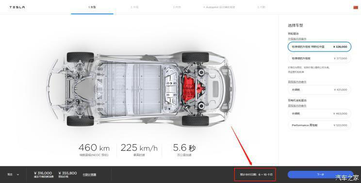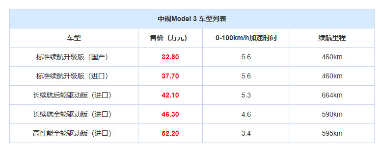 2019年5月31日,國產(chǎn)Model 3標(biāo)準續(xù)航升級版車型開放預(yù)訂,同時起售價格也正式公布,為32.80萬元。新車是目前進口Model 3入門車型(標(biāo)準續(xù)航升級版)的國產(chǎn)版本,配備60kWh容量電池組,擁有460km的工信部續(xù)航里程,0-100km/h加速時間為5.6秒,而預(yù)計交付時間為6-10個月。