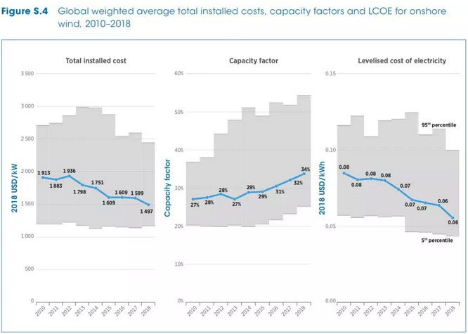 中國(guó)儲(chǔ)能網(wǎng)訊:國(guó)際可再生能源署發(fā)布最新的可再生能源發(fā)電成本報(bào)告,2010-2018年全球陸上風(fēng)電項(xiàng)目加權(quán)平均的單位投資成本、容量系數(shù)、平準(zhǔn)化成本走勢(shì)如下(以2018年美元計(jì)):