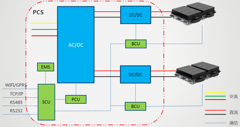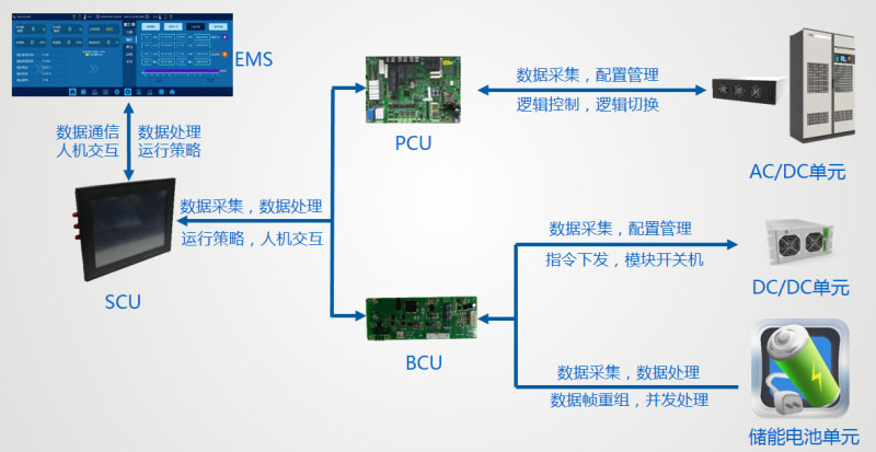 儲能電池種類繁多,對系統的安全穩(wěn)定性提出了重大考驗;儲能系統智能安全穩(wěn)定控制技術,采用分層管理、分層保護、分層控制的思想,集成BCU、PCU、SCU及EMS管理系統。BCU對電池包及DC/DC單元進行數據采集及數據處理,實現電池CAN數據幀重組保證40個電池包數據的并發(fā)處理以及系統指令下發(fā);PCU采集AC/DC單元數據上報到SCU,根據SCU指令進行邏輯控制,同時實現配置、告警及故障管理等;SCU與電池、電表、PCU、BCU、消防、EMS等通信,收集系統各部件數據,實現數據處理、運行策略、人機交互等功能;EMS通過與SCU的TCP/IP通信獲取系統的所有數據,提供人機交互、數據處理、運行策略及視頻監(jiān)控等其他服務,與第三方平臺通信,方便運維,確保了儲能系統的智能安全穩(wěn)定運行。