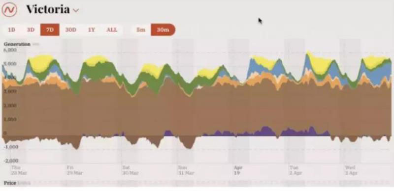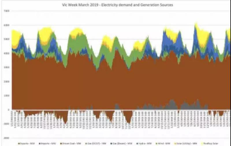 以下截圖來自opennem.org.au,內(nèi)容是維多利亞3月份發(fā)布的一周的“各類電源發(fā)電和用電需求圖”。在圖中可以看出,大部分電力來源于褐煤發(fā)電;還有部分來源于風(fēng)力發(fā)電(綠色區(qū)域),屋頂光伏發(fā)電(黃色區(qū)域)和光伏發(fā)電(橙色區(qū)域);另外, 在風(fēng)力比較弱時,對于水力發(fā)電(藍(lán)色區(qū)域)的需求較高。