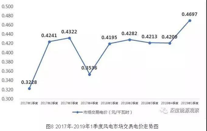2019年1季度,大型發(fā)電集團(tuán)風(fēng)電市場交易電量規(guī)模較大的省區(qū)分別是云南(32.4億千瓦時(shí))、新疆(15.2億千瓦時(shí))、蒙西(14.3億千瓦時(shí))和甘肅(13.5億千瓦時(shí));風(fēng)電上網(wǎng)電量市場化率超過40%的省區(qū)分別是青海(90%)、云南(79.9%)、寧夏(50.3%)和甘肅(49.6%),其平均交易電價(jià)(含跨省跨區(qū)送出交易電量電價(jià))分別為0.5267元/千瓦時(shí)、0.5265元/千瓦時(shí)、0.5729元/千瓦時(shí)和0.3834元/千瓦時(shí)。