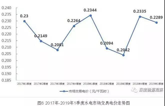 2019年1季度,大型發(fā)電集團(tuán)水電機(jī)組上網(wǎng)電量1232億千瓦時(shí),占其合計(jì)上網(wǎng)電量的14.1%;水電市場交易電量242億千瓦時(shí),水電上網(wǎng)電量市場化率達(dá)到19.7%;市場交易平均電價(jià)為0.2289元/千瓦時(shí),較上年同期降低0.0055元/千瓦時(shí)。