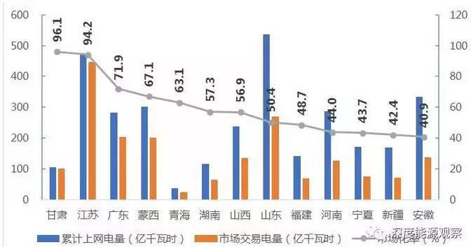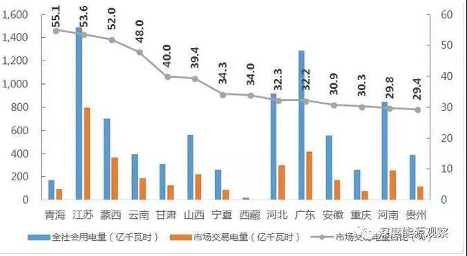 分省來看,市場交易電量占全社會用電量比重排序前三名的省區(qū)是青海(55.1%)、江蘇(53.6%)、蒙西(52.0%);電力市場交易電量規(guī)模排序前三名的省區(qū)分別是江蘇(799億千瓦時(shí))、廣東(415億千瓦時(shí))和山東(400億千瓦時(shí));省間外受電市場交易電量排序前三名的省區(qū)分別是江蘇(123億千瓦時(shí))、廣東(116億千瓦時(shí))、和山東(97億千瓦時(shí))。