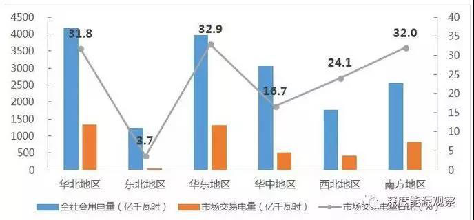 分區(qū)域市場來看,華北、華東區(qū)域市場交易電量規(guī)模分別為1330億千瓦時(shí)、1308億千瓦時(shí),兩個(gè)區(qū)域的市場交易電量規(guī)模占全國市場交易電量的比重達(dá)到了60%。華東、南方、華北三個(gè)區(qū)域的全社會用電量市場化率都超過了30%。