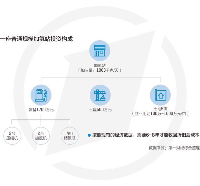 李參成等受訪者向1℃記者介紹,現(xiàn)有加氫站一般的建設(shè)規(guī)模都是1000千克/天的加注量,建設(shè)這樣的一座加氫站,設(shè)備占了大約1700萬元(包括兩臺500千克/12小時流量的壓縮機、兩臺加氫機、4組儲氫瓶),土建500萬元、土地6畝(各地的商業(yè)用地價格100萬~1000萬元/畝不等);按照現(xiàn)有的經(jīng)濟數(shù)據(jù)的話,需要6~8年的時間才能收回折舊后成本。