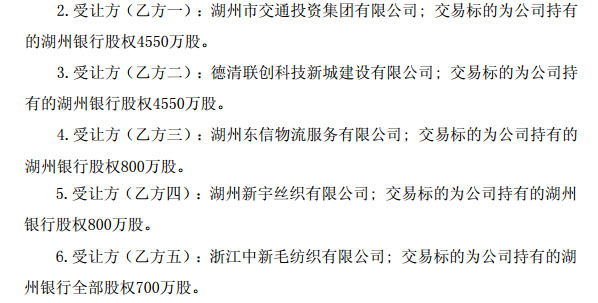 6月14日晚間,美都能源(600175,SH)發(fā)布公告稱,已于當(dāng)日與5家公司簽訂《股權(quán)轉(zhuǎn)讓協(xié)議》,擬出售所持湖州銀行股份有限公司(以下簡(jiǎn)稱湖州銀行)的全部股權(quán)(1.14億股,占湖州銀行總股本的12.5%),每股價(jià)格為3.5元,交易金額合計(jì)3.99億元。上述5家受讓方包括:湖州市交通投資集團(tuán)有限公司、德清聯(lián)創(chuàng)科技新城建設(shè)有限公司、湖州東信物流服務(wù)有限公司、湖州新宇絲織有限公司、浙江中新毛紡織有限公司(如下圖)。