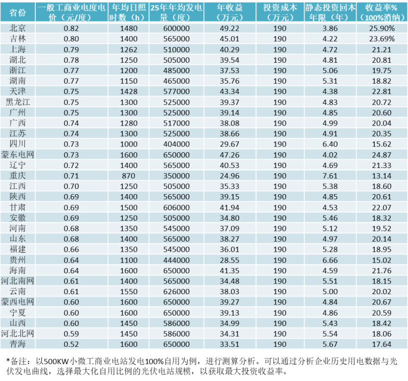 小微工商業(yè)光伏電站的用電主體,主要是中小工商企業(yè)主,且主要是民營企業(yè)。該類業(yè)主大多享受一般工商業(yè)電價(jià),即使按照今年兩會(huì)“一般工商業(yè)電價(jià)再下降10%”的要求,也比大工業(yè)用電價(jià)格高。根據(jù)全國各省市一般工商業(yè)電價(jià)水平下的投資收益率簡易測算分析,除重慶市外其他地區(qū)的電站靜態(tài)投資回報(bào)期都在4到6年間(見下圖)。