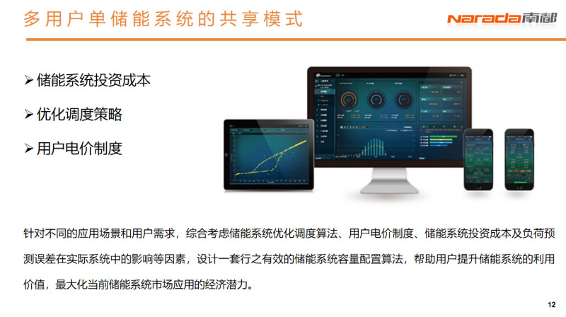 同時也要綜合考慮整個儲能系統(tǒng)的配置,目前南都做了很多的儲能系統(tǒng)方案,我們會發(fā)現(xiàn)你要考慮它的綜合投資成本,要考慮它的調(diào)度策略,要考慮它的負荷預測,我們基于的是用戶的歷史數(shù)據(jù),并不是說你用電量大你就一定能做儲能,這個我們也是排除了很多可能性的風險因素,包括你的占地面積,各種因素考慮之后,我們才會決定我們一方要不要上儲能設備,這個不是簡單的說只要你用電量大,只要你想做,只要你有額外的充電量,你就可以上儲能,這個還有很多的前提條件。我們目前在無錫星州工業(yè)園就做了一個多用戶單儲能系統(tǒng),每天能放16萬的電。什么概念呢,它這個工業(yè)園區(qū)每個月的用電量在6000萬到7000萬度,我們每天保證儲能能夠放16萬度電。工業(yè)園區(qū)里面有好多家企業(yè),每家企業(yè)的用電肯定是存在差異性的,這個對園區(qū)來說,肯定是有效益的,而且我們幫助用戶,如果用戶他有檢修的一些需求,他有需求側(cè)響應的需求,我們儲能都能幫他實現(xiàn),所以儲能在這里面體現(xiàn)的是綜合價值。