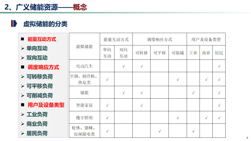 廣義儲能資源類型很多,可以從不同的分類,比如按照能量互動方式可以分為單向互動和雙向互動,按照調度響應方式可以分為可轉移負荷、可平移負荷、可削減負荷,按照用戶及設備類型可以分為工業(yè)負荷、商業(yè)負荷、居民負荷。