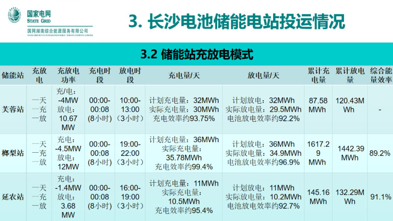 這張表是儲能電站的充放電模式,芙蓉站因為它是6月10號之后才正式交界投運(yùn)的,所以它的綜合效率數(shù)據(jù)意義不大。三個站都是一天一充一放,但都不是滿充滿放的狀態(tài)。榔梨站運(yùn)行的時間比較長,充放電達(dá)到了一千多兆瓦。延農(nóng)站是6月初正式投運(yùn),大概運(yùn)行了十多天。綜合能量效率都比較高,將近90%左右。