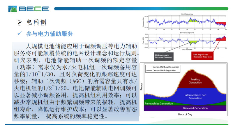 第二個(gè)電網(wǎng)側(cè)應(yīng)用是參與電力系統(tǒng)的輔助服務(wù)。電池儲(chǔ)能系統(tǒng)的一次調(diào)頻容量是水電或者火電容量配置的十分之一到三十分之一,而且系統(tǒng)的負(fù)荷跟蹤速度可以達(dá)到秒級(jí)。參加輔助二次調(diào)頻所需的容量是水電火電機(jī)組的二分之一到二十分之一,電池儲(chǔ)能系統(tǒng)參與電網(wǎng)的輔助調(diào)頻可以顯著減少系統(tǒng)調(diào)頻的備用容量,提高機(jī)組的利用率,同時(shí)可以避免機(jī)組頻繁的調(diào)節(jié)造成的損耗,降低機(jī)組的運(yùn)行成本,也可以顯著提高整個(gè)系統(tǒng)的暫態(tài)頻率質(zhì)量。