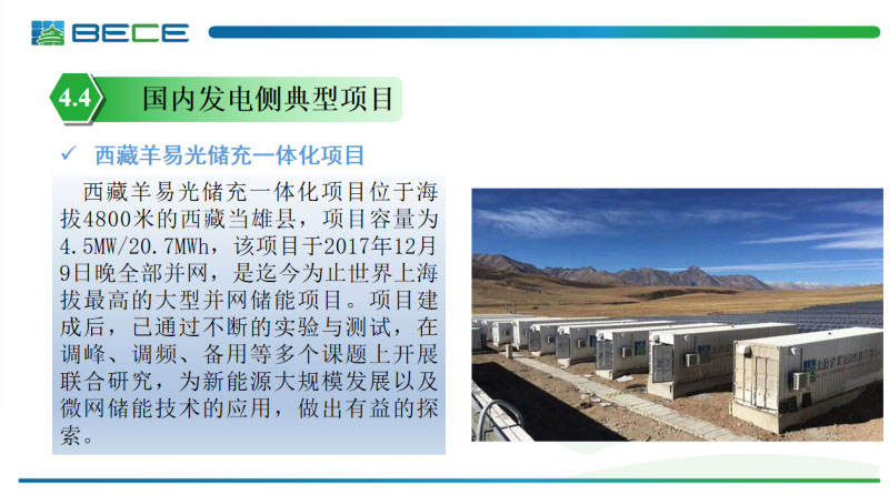 最后看一下北控公司自己的工程實(shí)踐。我們選了幾個(gè)比較典型的項(xiàng)目,包括新能源廠站側(cè)的西藏羊易光儲(chǔ)項(xiàng)目,電廠側(cè)輔助調(diào)頻項(xiàng)目是山西長(zhǎng)治儲(chǔ)能調(diào)頻項(xiàng)目,光儲(chǔ)充結(jié)合的是力信能源鎮(zhèn)江產(chǎn)業(yè)園的光儲(chǔ)充微電網(wǎng)項(xiàng)目,與電力市場(chǎng)結(jié)合是我們?cè)诎拇罄麃喣习闹薜腤hyalla的光儲(chǔ)項(xiàng)目。
