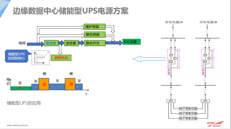 另外在儲(chǔ)能型的UPS電源解決方案中,邊緣數(shù)據(jù)中心的發(fā)展越來越趨向于地方的減小,規(guī)模沒那么大。地方?jīng)]那么大的情況下,原有的數(shù)據(jù)中心或者說邊緣計(jì)算配套的電池系統(tǒng)基本以鉛酸電池為主,我們現(xiàn)在鋰電池的發(fā)展越來越成熟了,鋰電池的應(yīng)用在數(shù)據(jù)中心里面拓展可能也會(huì)越來越多。鋰電池因?yàn)槟芰棵芏鹊膯栴},功率密度的問題等等,在這里面應(yīng)用還是比較有優(yōu)勢(shì)的,特別是分布在城市中心各個(gè)領(lǐng)域里面,地域資源非常緊缺的情況下,我們可以把UPS結(jié)合鋰電池的應(yīng)用,結(jié)合儲(chǔ)能的策略,減少鋰電池長期處于浮充的問題。另外可以把鋰電池的高循環(huán)次數(shù)充分利用出來,減少邊緣計(jì)算中心電費(fèi)的成本。因?yàn)檎麄€(gè)數(shù)據(jù)中心的能耗,非核心設(shè)備用電成本占了一半左右,這塊也是重點(diǎn)節(jié)費(fèi)的地方。