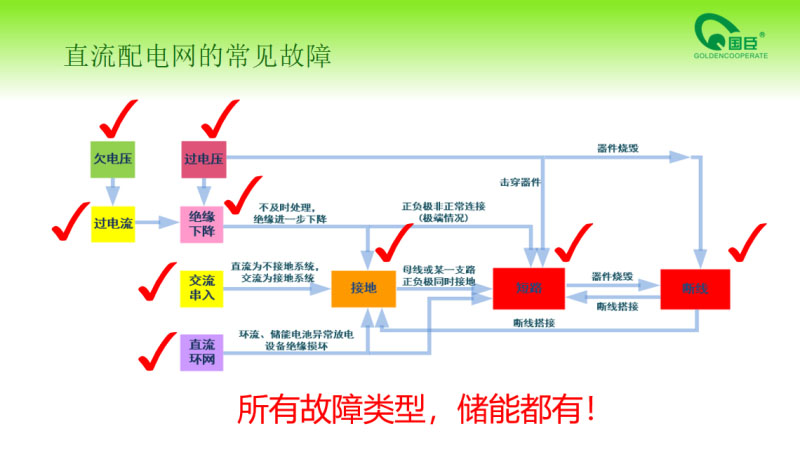 這是我們直流側(cè)常見(jiàn)的故障類型,大家看看日常分析,短路和過(guò)流經(jīng)常是我們重點(diǎn)分析的,事實(shí)上我們還有其他很多的故障現(xiàn)象,比如說(shuō)欠電壓、過(guò)電壓,韓國(guó)的事故里面,過(guò)電壓從交流側(cè)PCS過(guò)來(lái)的。還有絕緣和接地,絕緣下降和接地是我們最常見(jiàn)的故障形式之一,所以我們必須要在直流側(cè)裝一個(gè)接低保戶,剛才說(shuō)的阻抗式的保護(hù)在我們直流側(cè)只能有一套同時(shí)工作,那就可能出問(wèn)題。