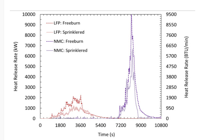 FM Global公司對(duì)磷酸鐵鋰(LFP)電池或鎳錳鈷氧化物(NMC)電池進(jìn)行自由燃燒和噴淋試驗(yàn)時(shí)的放熱率比較