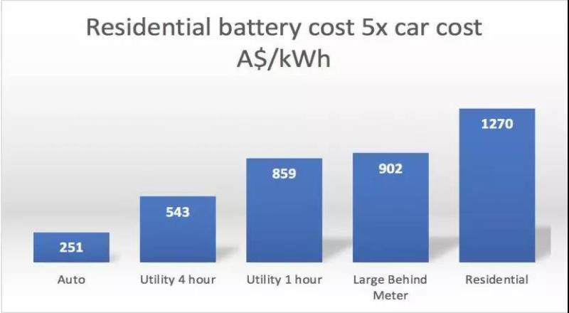 基于每千瓦時(shí)的安裝成本(美元),家用電池的安裝成本約為電動汽車所用電池的5倍。除了電池本身的費(fèi)用,家用電池比動力電池多出來的費(fèi)用,主要來源于除電芯外,儲能電池系統(tǒng)中其他部件的成本費(fèi)用。