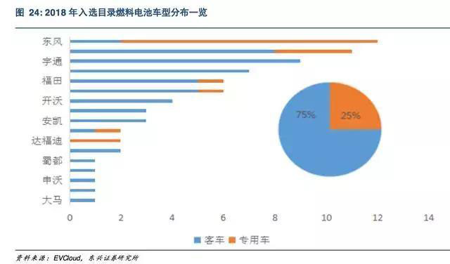 2018年發(fā)布的6-12批新能源汽車推薦目錄中,燃料電池汽車共有72款車型入選,其中客車54款,占比達(dá)到75%。2018年入選的車型中,燃料電池系統(tǒng)額定功率達(dá)到30-40kw的車型有45款,達(dá)到40-50kw的車型有13款,50kw以上的車型有14款。目前國內(nèi)燃料電池水平總體與國外差距較大,日本的燃料電池車型額定功率基本在120-200kw。