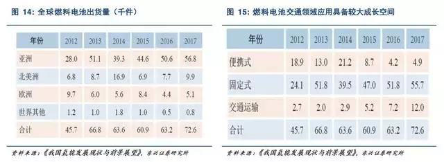 從全球燃料電池出貨量來看,近年來呈穩(wěn)步提升態(tài)勢。2017年全球燃料電池出貨量達(dá)到7.26萬件,其中大部分為固定式(主要為燃料電池固定發(fā)電)應(yīng)用,車輛領(lǐng)域成長迅速,有望成為未來主流的應(yīng)用場景。