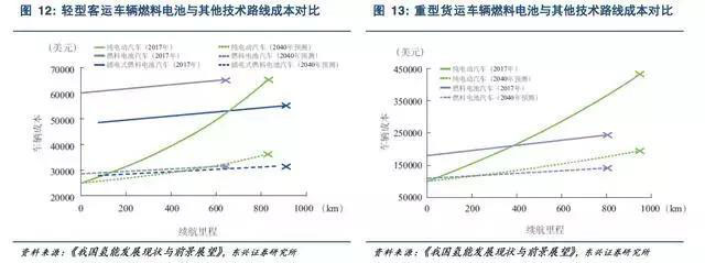 燃料電池功率和儲能單元彼此獨立,增加能量單元對車輛成本和車重影響相對較小,氫燃料電池在重型交通領(lǐng)域相比鋰電池具有更強的技術(shù)適應(yīng)性。隨著車重和續(xù)航的提升,燃料電池汽車成本將逐步接近甚至低于純電動汽車。