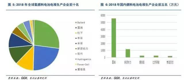 根據(jù)高工產(chǎn)研氫電研究所的數(shù)據(jù),2018年氫燃料電池領(lǐng)軍企業(yè)分別為巴拉德、國鴻氫能、松下、豐田、本田??紤]到國鴻氫能主要為引進(jìn)巴拉德的技術(shù)路線,巴拉德及其相關(guān)公司占全球燃料電池電堆生產(chǎn)的主流。