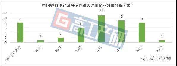 高工產(chǎn)研氫電研究所(GGII)調(diào)研分析,截至2019年6月,中國共有燃料電池系統(tǒng)供應(yīng)商46家(含自產(chǎn)電堆的企業(yè))。46家系統(tǒng)企業(yè)中,2015年~2018年成立的企業(yè)有34家,其中2016年成立的燃料電池系統(tǒng)企業(yè)最多,為11家。