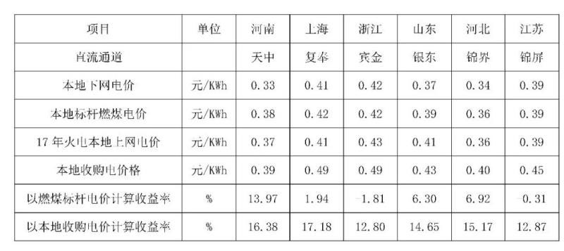根據(jù)國家能源局關(guān)于2017年度全國電力價(jià)格情況監(jiān)管通報(bào),國網(wǎng)2017年電力市場交易信息報(bào)告,選取河南省,江蘇省、浙江、山東、上海、河北等省進(jìn)行分析,輸送電量分為水電、火電、新能源和火電打捆。根據(jù)落地省落地電價(jià)分別與落地省燃煤標(biāo)桿電價(jià)、本省電網(wǎng)電力平均收購電價(jià)計(jì)算收益率見下表1。