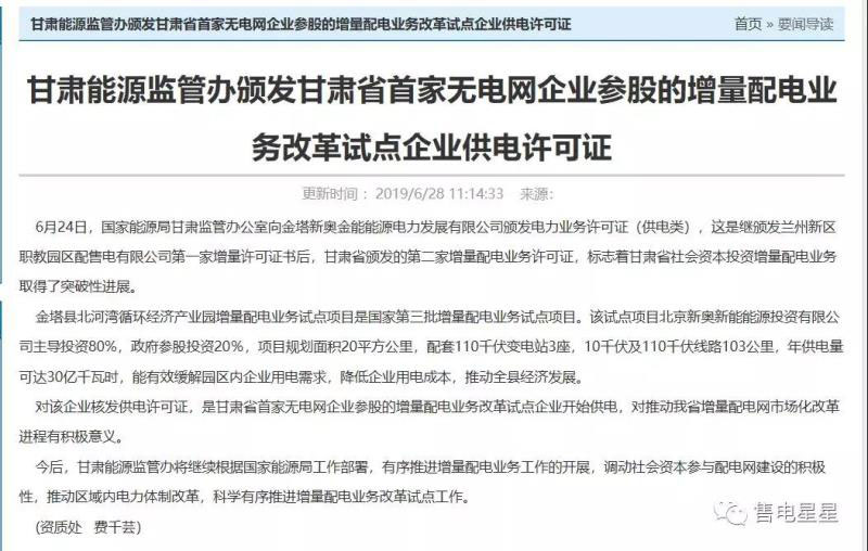 這是甘肅省頒發(fā)的第二家增量配電業(yè)務(wù)許可證,新奧金能是北京新奧新能能源投資有限公司主導(dǎo)投資80%、政府參股投資20%設(shè)立的。而北京新奧新能能源投資有限公司的主營業(yè)務(wù)是項目投資;銷售機械設(shè)備;節(jié)能、分布式能源及其他能源利用技術(shù)開發(fā)、技術(shù)咨詢、技術(shù)轉(zhuǎn)讓、技術(shù)推廣服務(wù);合同能源管理;新能源研發(fā);施工總承包;專業(yè)承包;工程勘察設(shè)計;經(jīng)濟信息咨詢(不含中介服務(wù));軟件開發(fā);租賃建筑工程機械設(shè)備;燃?xì)饨?jīng)營;電力供應(yīng)。并沒有擁有電網(wǎng)呢。