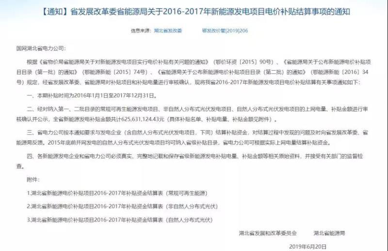該《通知》經(jīng)對納入第一、二批目錄的常規(guī)可再生能源發(fā)電項(xiàng)目、非自然人分布式光伏發(fā)電項(xiàng)目、自然人分布式光伏發(fā)電項(xiàng)目的上網(wǎng)電量、補(bǔ)貼金額進(jìn)行審核確認(rèn)并公示,湖北全省新能源發(fā)電補(bǔ)貼金額共計(jì)625,631,124.43元。