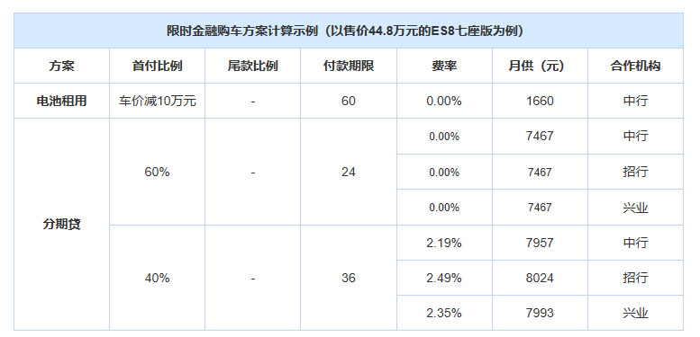 針對在2019年7月-9月提車的ES8、ES6首發(fā)紀(jì)念版/性能版用戶,蔚來汽車還提供了3種限時金融購車方案。第一種方案是:租用電池,車價立減10萬元,電池租用固定60期,月供為1660元。第二種方案為分期貸:首付60%即可享2年0利率,首付40%可享3年低利率。
